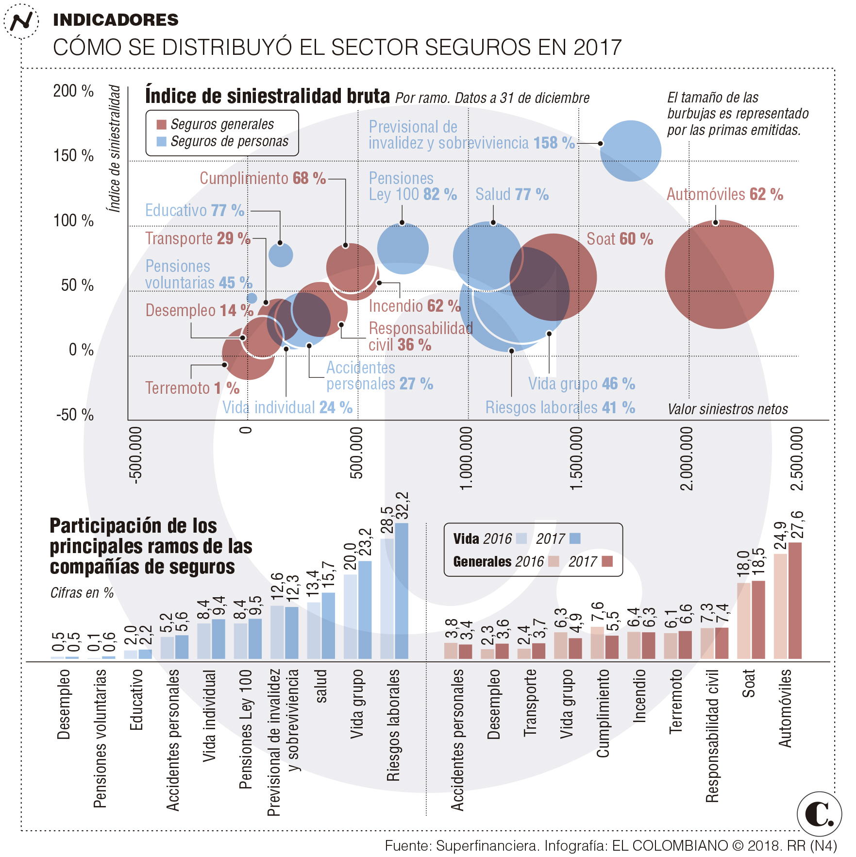 El segmento laboral contribuyó con el 32,16 % al registrar un valor de primas emitidas de 2,89 billones de pesos, entre los 13,5 billones que correspondieron a seguros de vida. Siendo el ramo que registró el mayor incremento porcentual (3,62 %) frente al total observado en el año 2016 de 28,5 %.